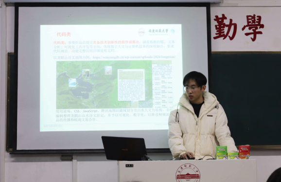 分享会中,研究生姚昭伦立足即将开展的首届“未来人文”全国数字人文创新成果大赛,聚焦作品类型、示例展示,进行经验分享。全方位展示了如何利用数字人文技术并结合人文知识进行新视野的开拓。他通过专业的知识讲解,丰富的实战经验,生动阐述了代码类、视频类、游戏类等多种类型所需的技术应用,为学生的作品创新赋能,激发学生们的潜力。